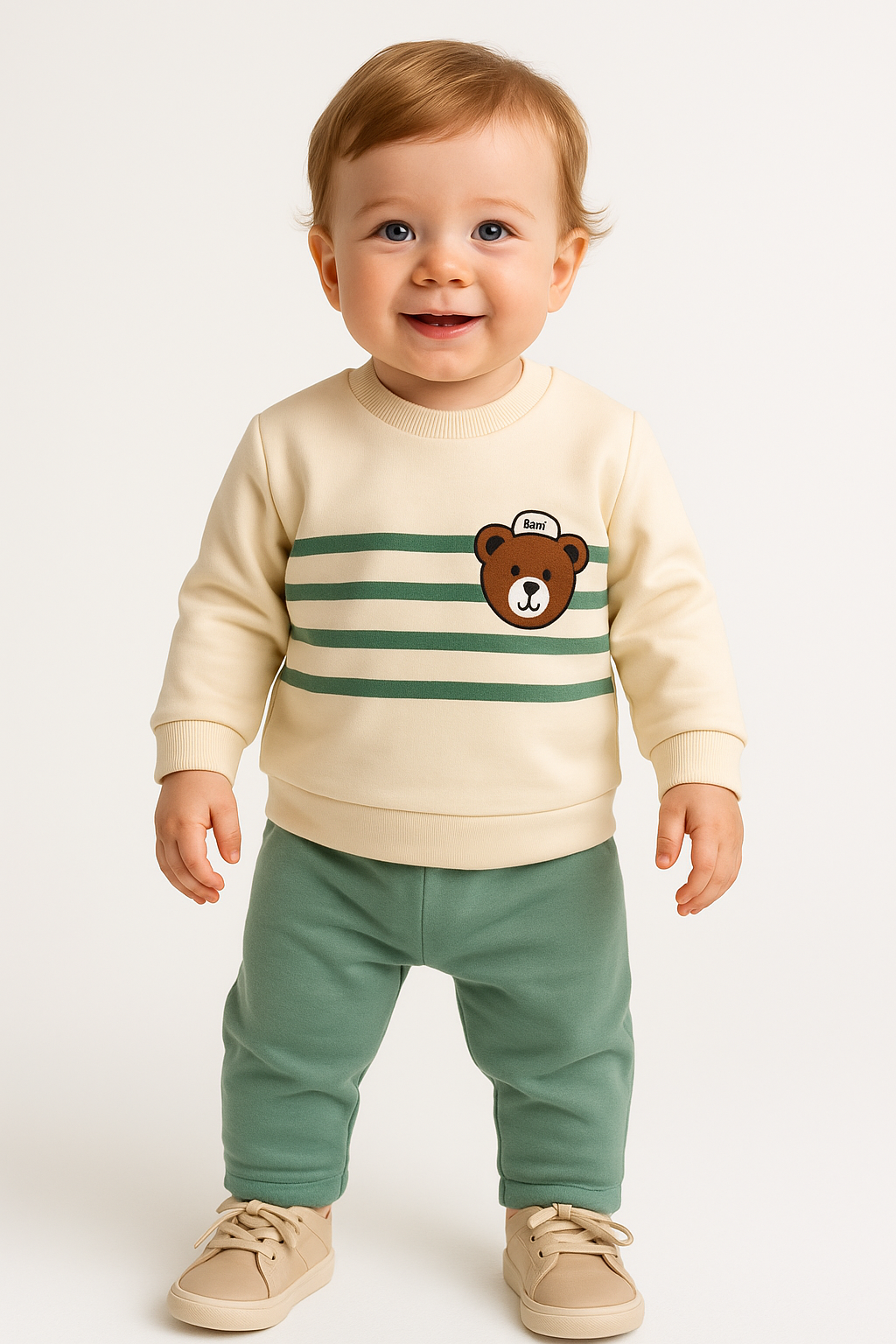 1714 - Bear Baskılı Çizgili Aylık Erkek Bebek Takım - Mint Yeşili (1714)