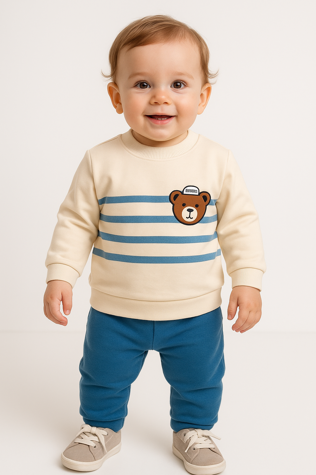 1714 - Bear Baskılı Çizgili Aylık Erkek Bebek Takım - Saks (1714)