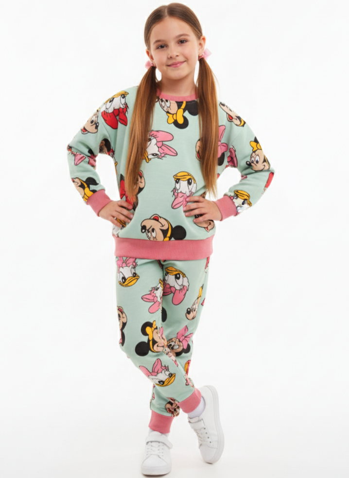 1717 - Karakter Desenli Kız Çocuk Takım - Yeşil - Pembe