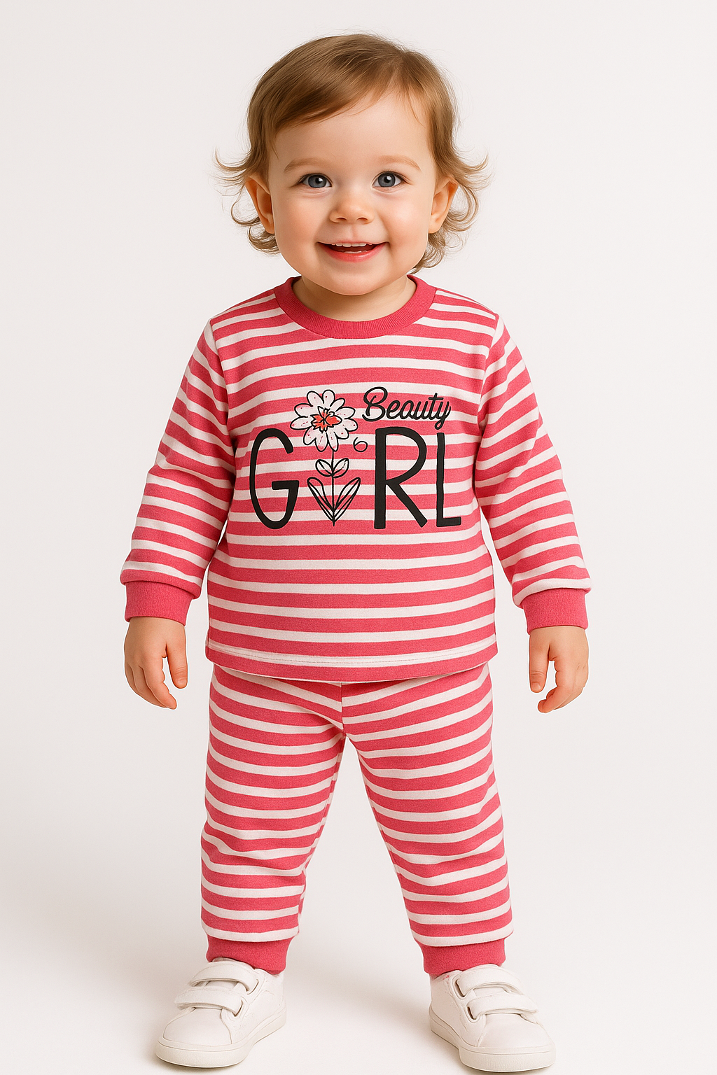 1743- Girl Baskılı Çizgili Kız Aylık Takım - Fuşya (1743)