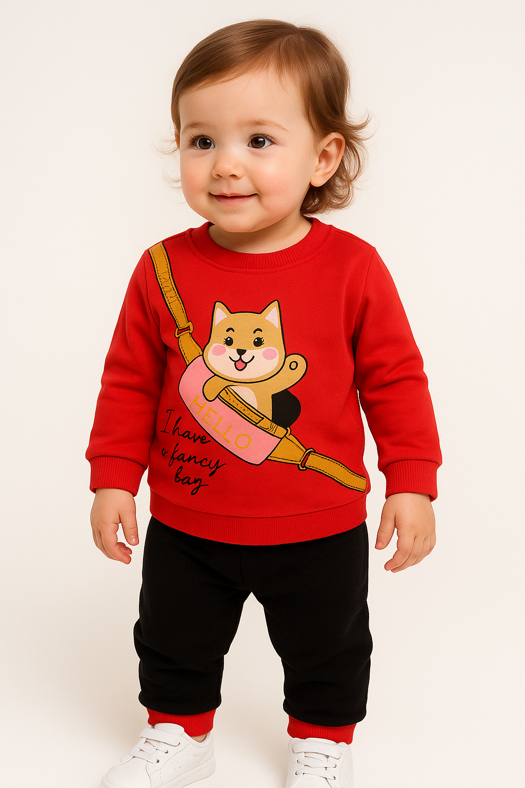 1744- Kedi Baskılı Çizgili Kız Aylık Takım - Kırmızı (1744)