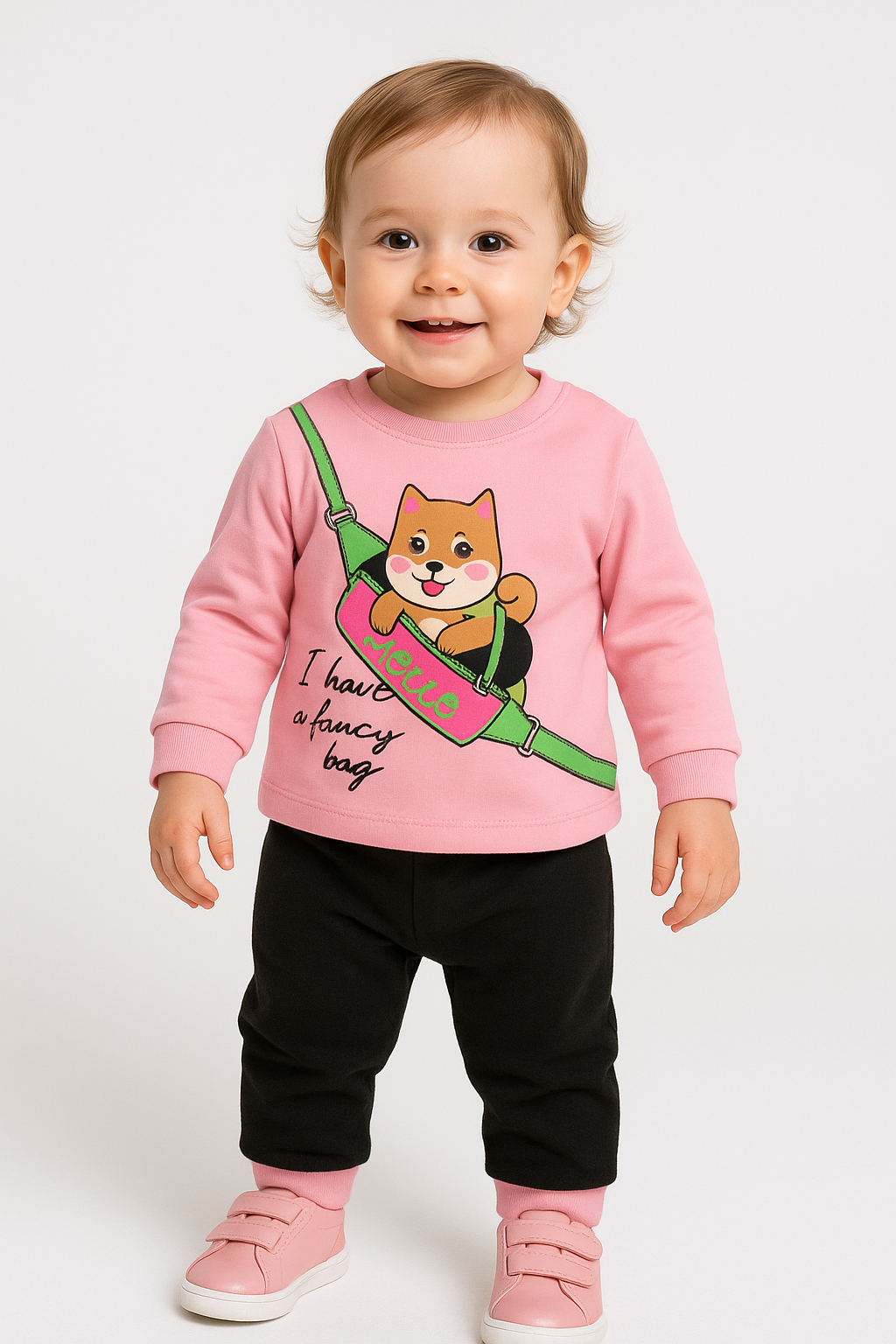 1744-  Kedi Baskılı Çizgili Kız Aylık Takım - Toz Pembe
