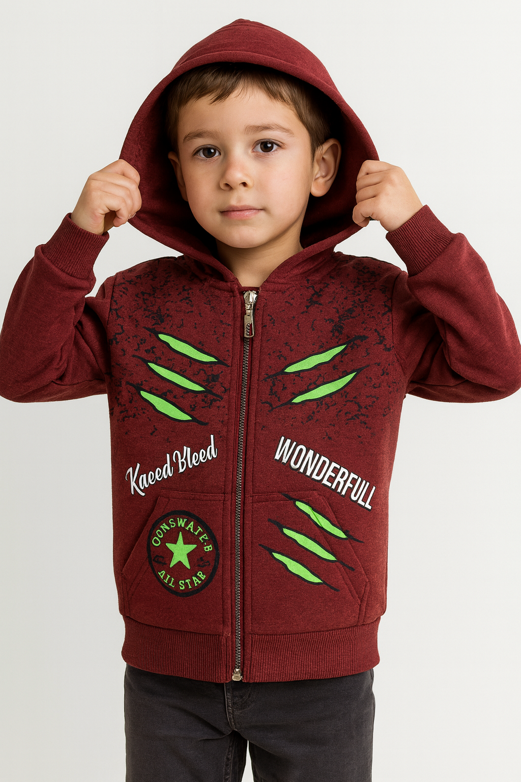 1759- Wonderfull Baskılı Kapüşonlu Erkek Çocuk Hırkası - Bordo (1759)