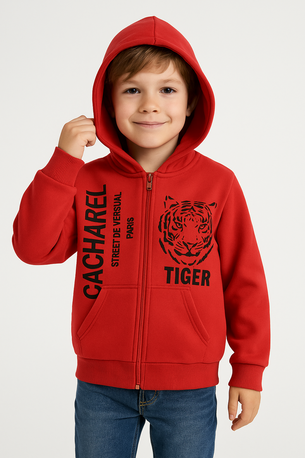1760 - Kaplan Baskılı Kapüşonlu Erkek Çocuk Hırkası - Kırmızı (1760)