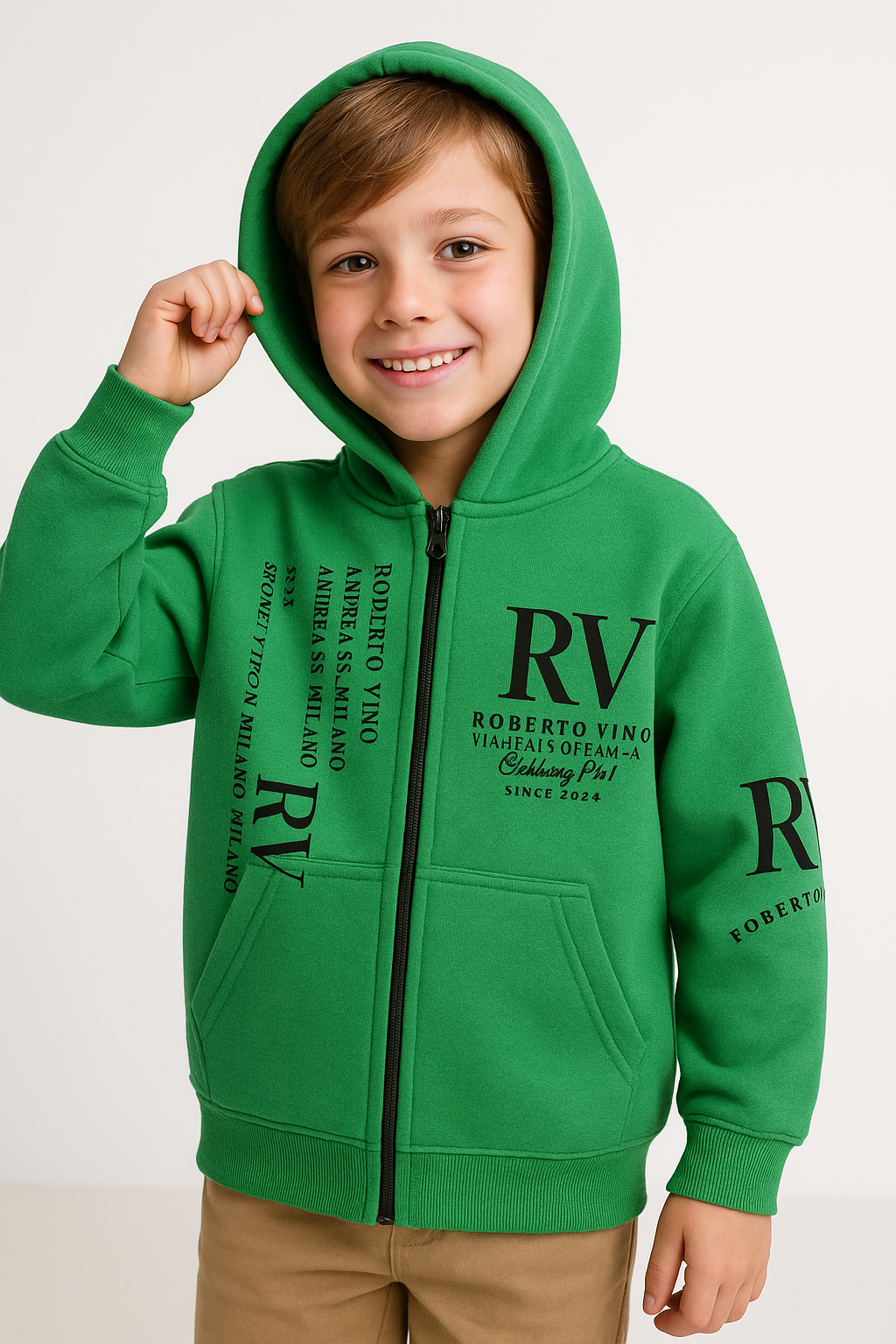 1760 - RV Baskılı Kapüşonlu Erkek Çocuk Hırkası - Yeşil (1760)