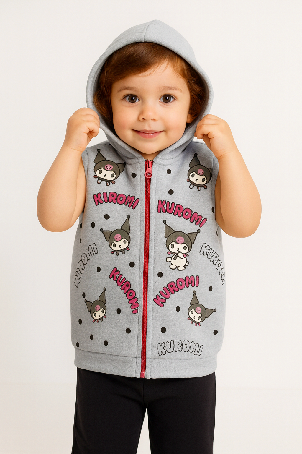 1766 - Karakter Baskılı Kapüşonlu Kız Yelek - Buz Mavisi