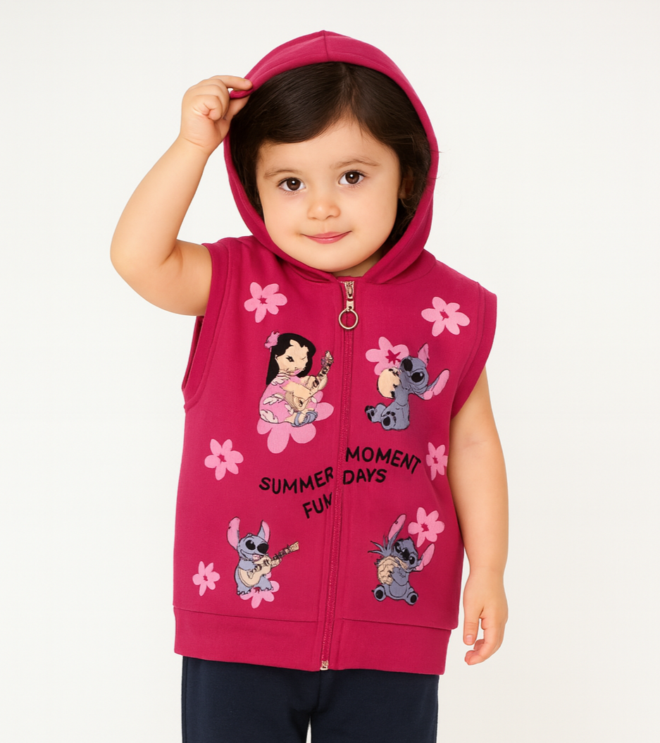1767 - Karakter Desenli Kapüşonlu Kız Yelek - Fuşya