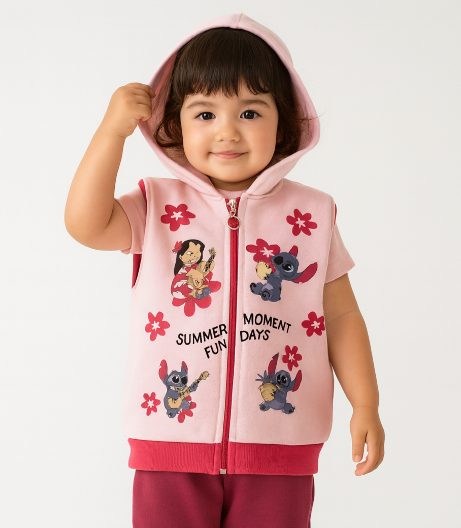 1767 - Karakter Desenli Kapüşonlu Kız Yelek - Pembe