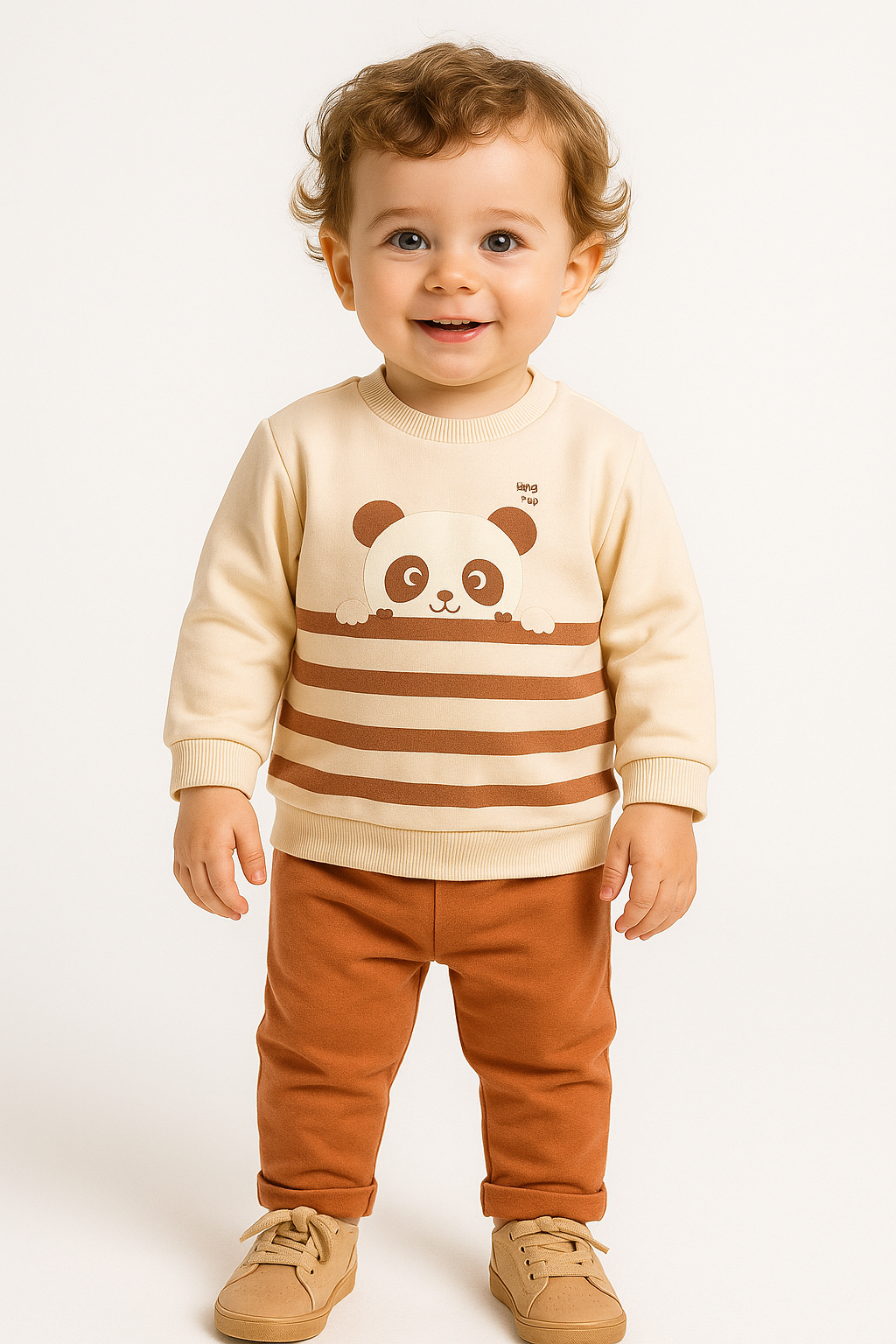 1776 - Panda Baskılı Çizgili Aylık Erkek Bebek Takım - Kahve (1776)