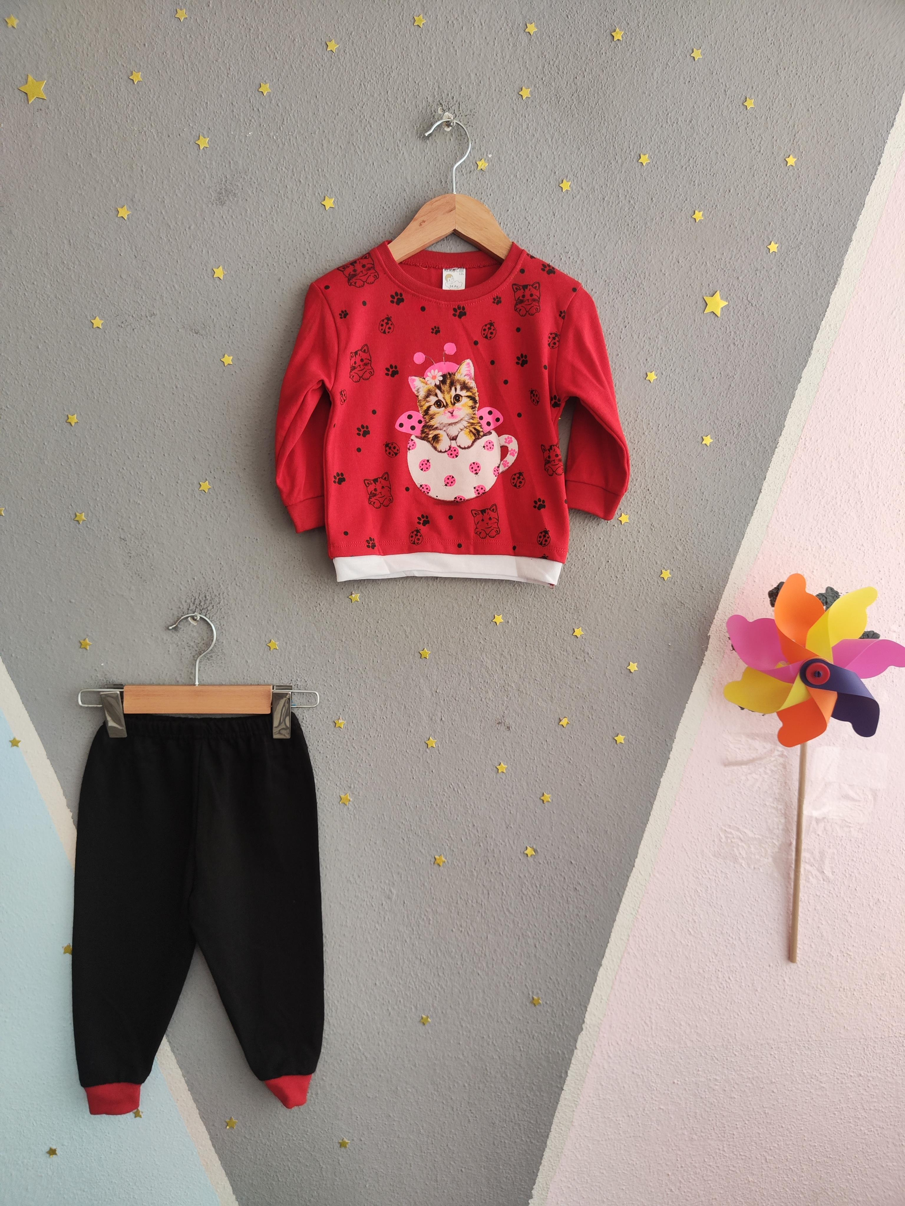 1793-  kedi ve Uğurböceği Baskılı  Aylık Kız Çocuk Takımı - Kırmızı