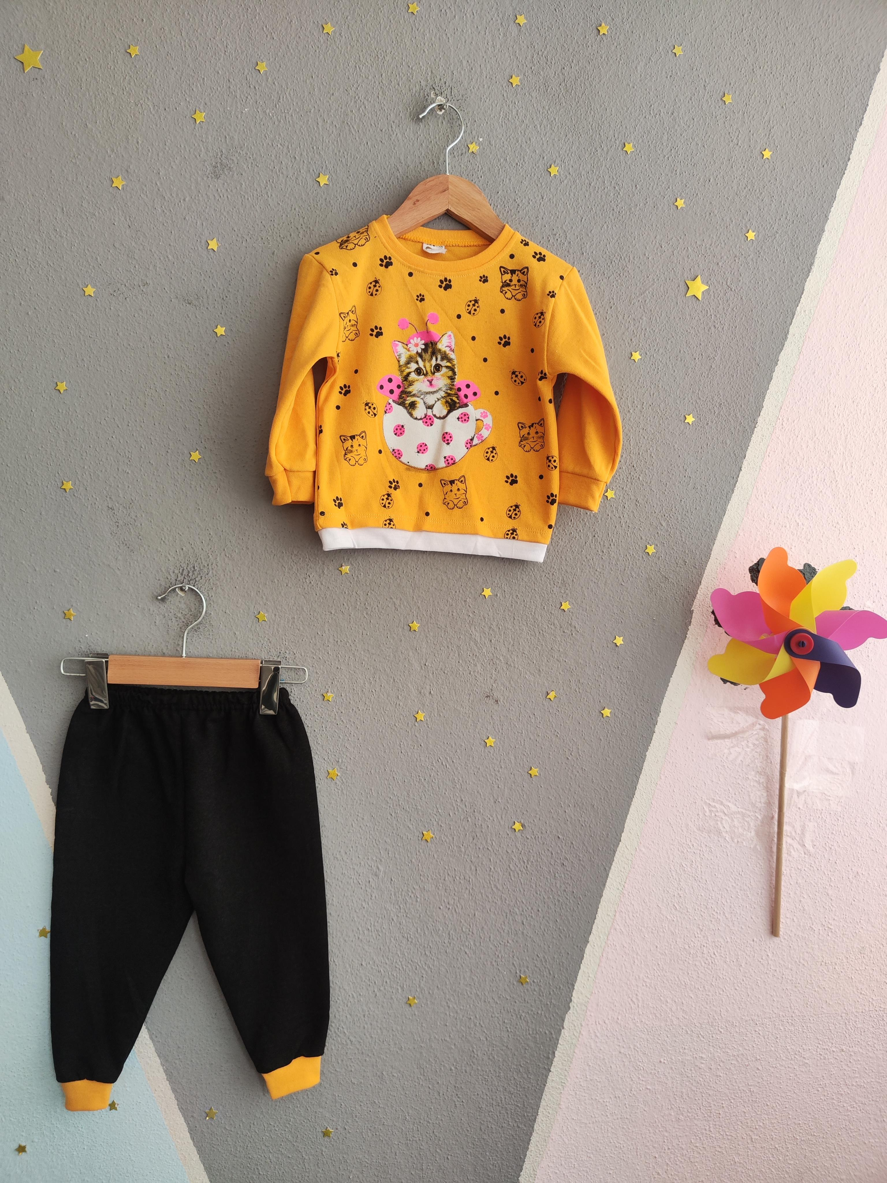 1792-  kedi ve Uğurböceği Baskılı  Aylık Kız Çocuk Takımı - Sarı