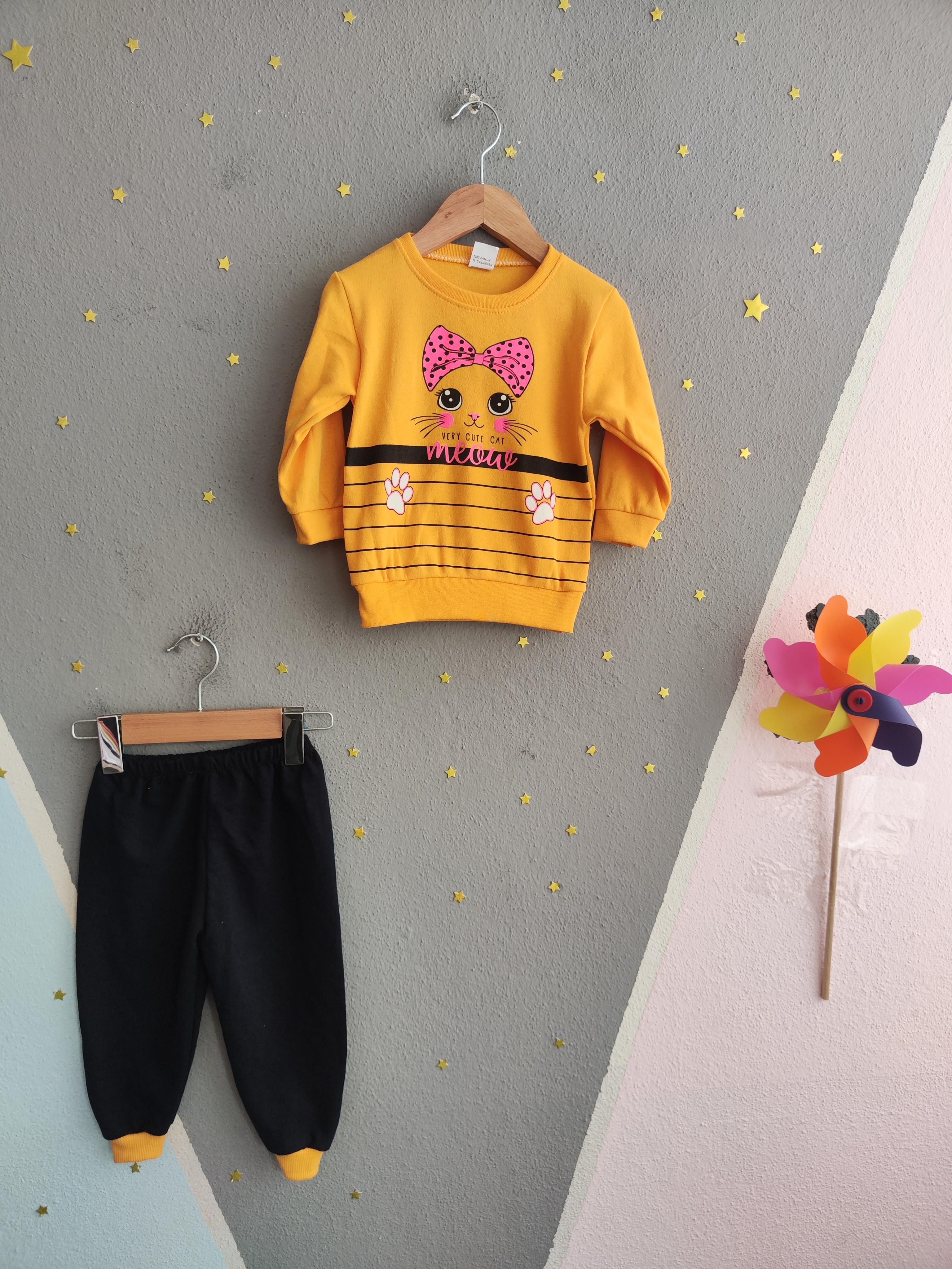 1794- Kurdeleli Kedi Baskılı Aylık Kız Çocuk Takımı - Sarı (1794)