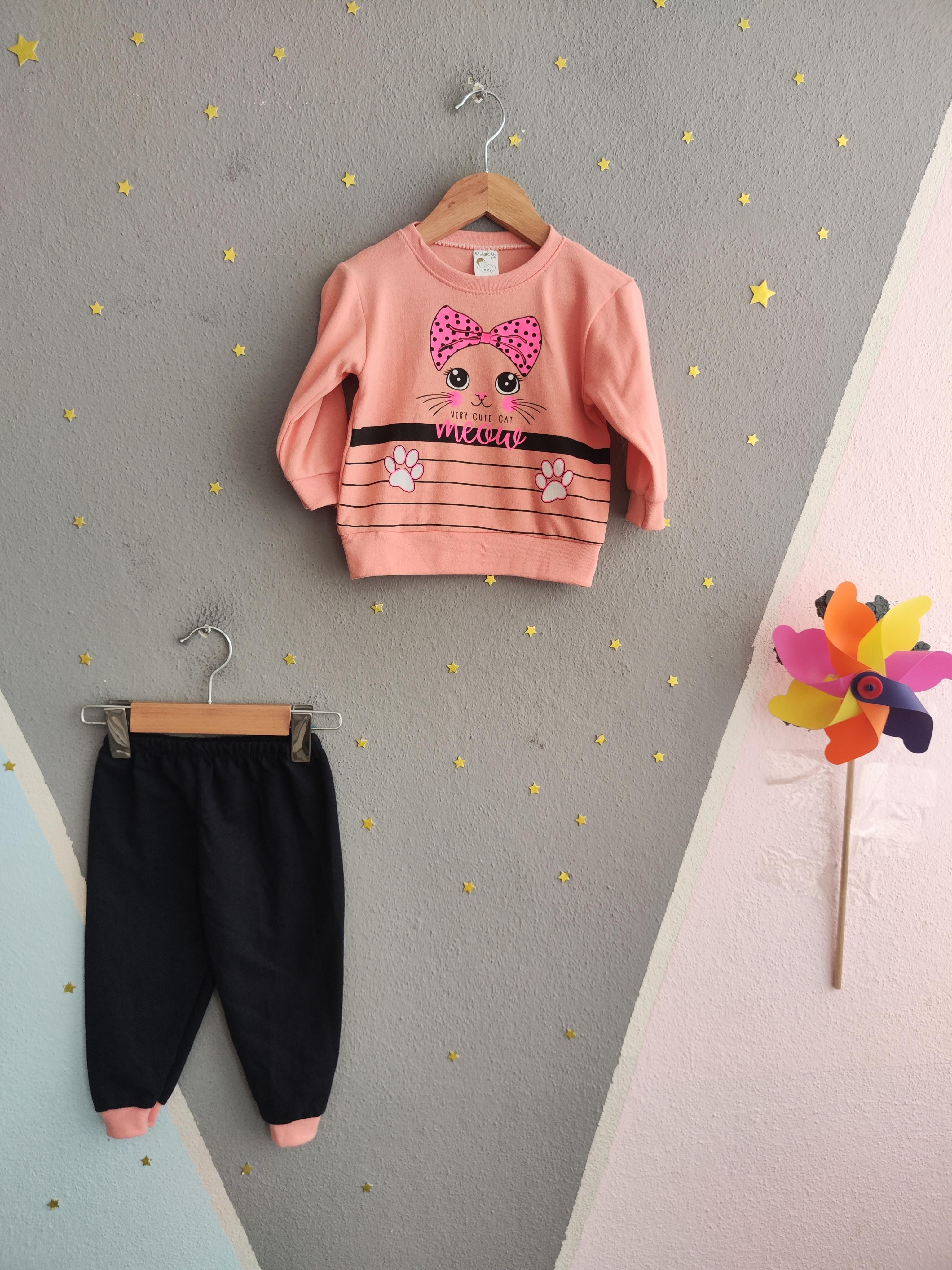 1794-  Kurdeleli Kedi Baskılı  Aylık Kız Çocuk Takımı - Somon