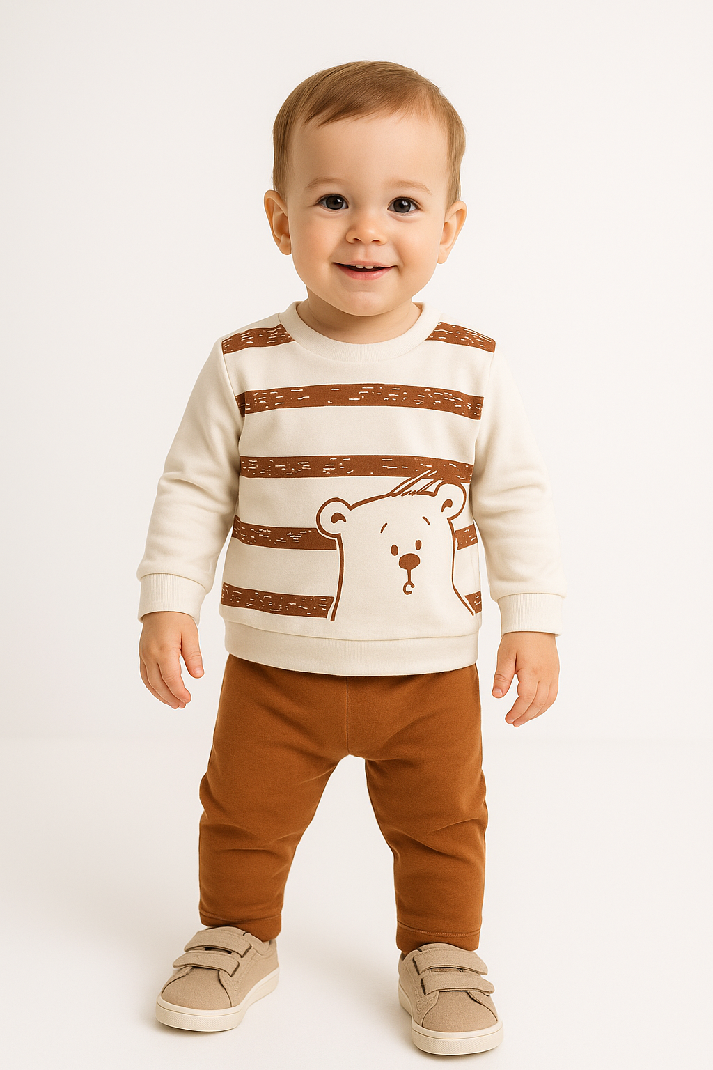 1804 - Ayıcık Baskılı Cizgili Aylık Erkek Bebek Takım -Kahve (1804)