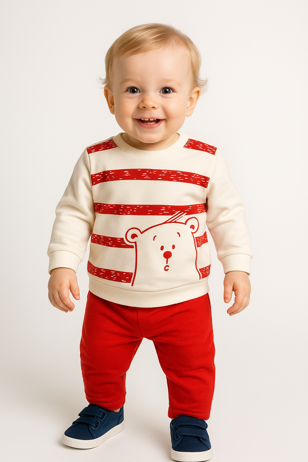 1804 - Ayıcık Baskılı Cizgili Aylık Erkek Bebek Takım -Kırmızı (1804)