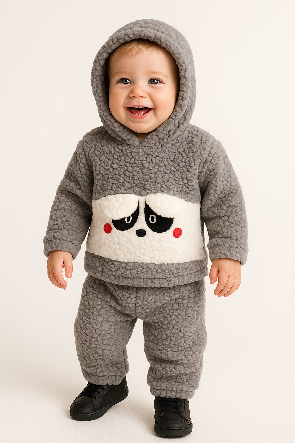 1813 - Kulaklı Hayvan Baskılı Kapüşonlu Peluş Erkek Bebek Takımı - Füme (1813)